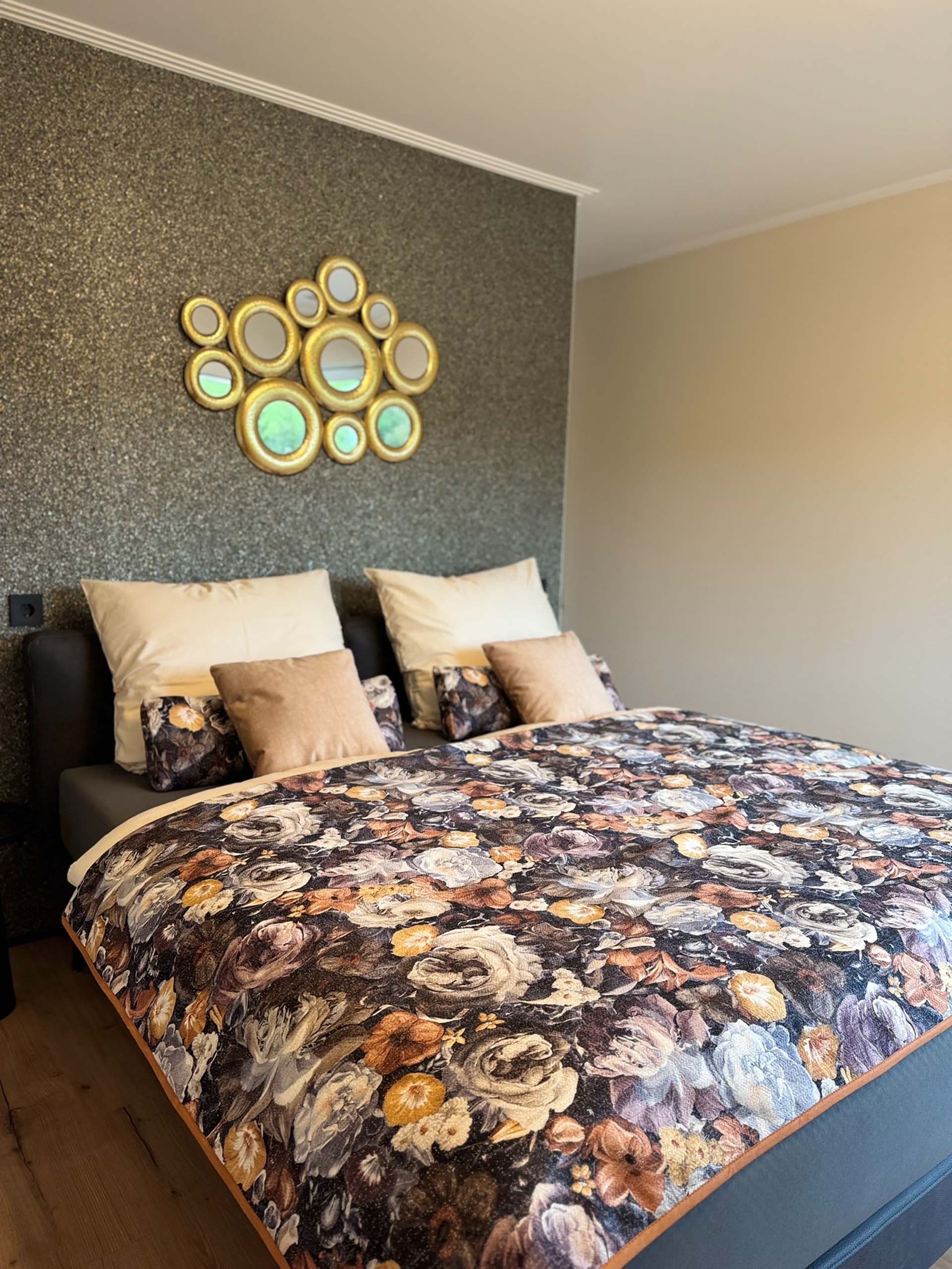Das angrenzende Wohnzimmer eröffnet mit großen Fensterflächen eine lichtdurchflutete Atmosphäre, während das Badezimmer mit seiner freistehenden Badewanne und edlen Oberflächen ein echtes Wellness-Erlebnis bietet.